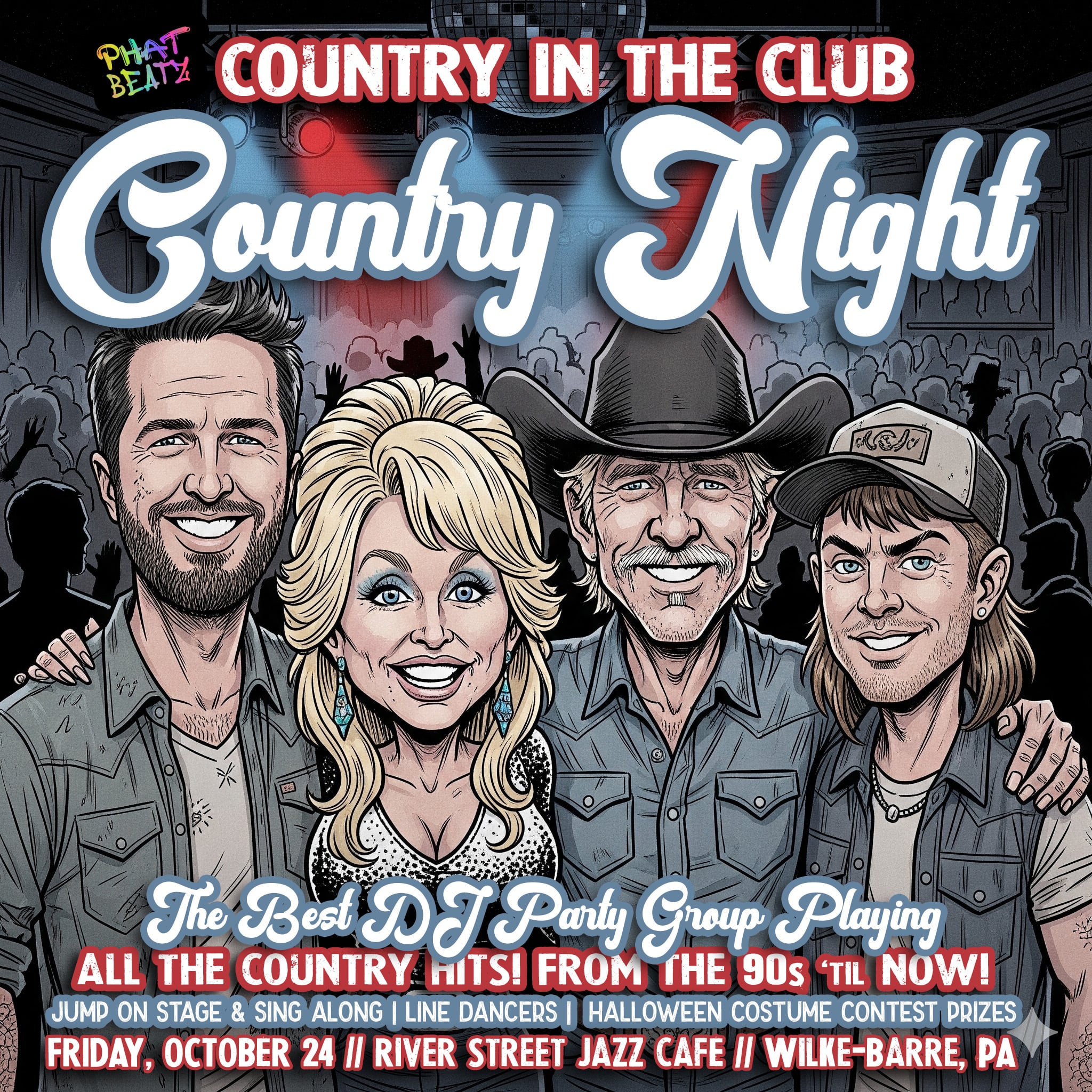 Get ready to swap your boots for your dancing shoes, Wilkes-Barre! We're bringing the Honky Tonk Heat to the River Street Jazz Cafe on Friday, October 24th for a night of pure, unadulterated country music celebration! This ain't your grandma's quiet porch swing—it's Country in the Club, and it's going to be a wild one! We've wrangled up the East Coast's premier DJ party group, Phat Beatz, and they'll be spinning every one of your favorite country jams. We're talking non-stop hits, from the modern chart-toppers you hear on the radio today back to the classic '90s songs that defined your youth. Think Luke Combs to Garth Brooks, Morgan Wallen to Alan Jackson, and plenty of Dolly and Zach in between! Whether you're a "Red Solo Cup" sipper, a "Country Girl Shake It For Me" dancer, or just looking to sing your heart out, this night is for you. Got a burning desire to sing a chorus? Grab a mic and get on stage with the DJ! We encourage it!